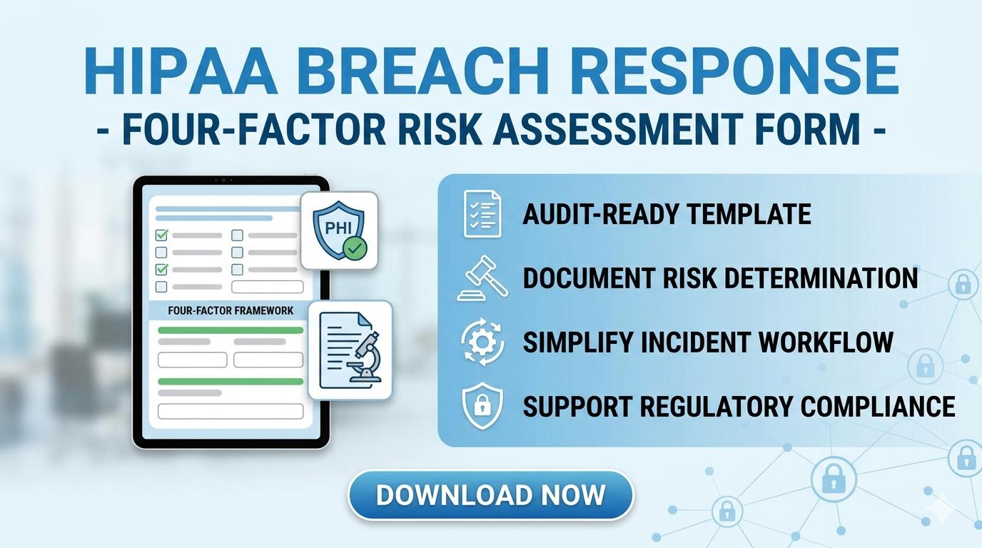 The HIPAA Breach Risk Assessment Form gives your organization a structured tool for applying the four-factor low probability of compromise analysis required under the Breach Notification Rule at 45 CFR 164.402. When an incident involves unsecured protected health information, this form walks your team through the analysis in a way that creates a clear, defensible record.