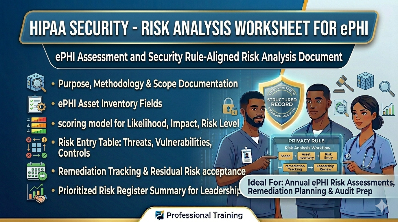 The HIPAA Risk Assessment Worksheet provides a structured, practical tool for completing the risk analysis required under 45 CFR 164.308(a)(1). It walks your organization through a systematic process of identifying assets, threats, vulnerabilities, existing controls, likelihood, impact, and residual risk, producing a documented risk register aligned to OCR guidance and NIST SP 800-30 methodology.
