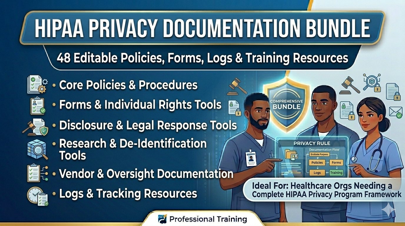 For organizations preparing for an OCR audit, refreshing outdated policies, or building a privacy program for the first time, this bundle covers the full scope of what is needed across core policies, patient-facing forms, disclosure tools, vendor management, research, de-identification, marketing, and workforce training.